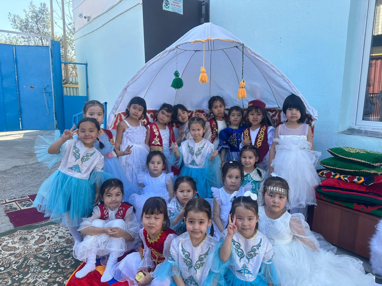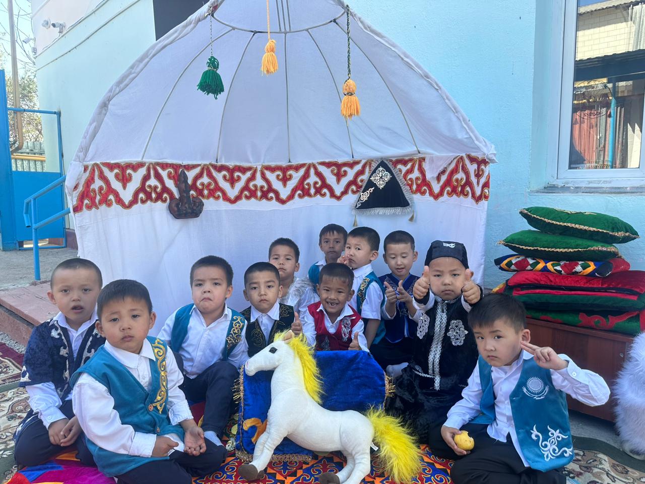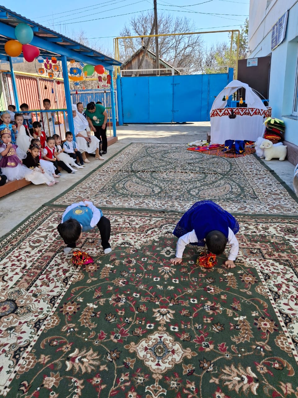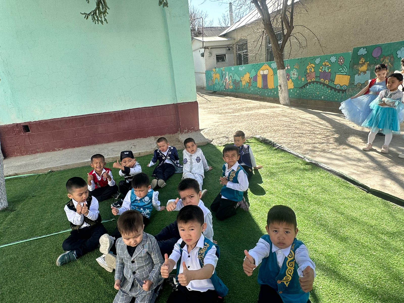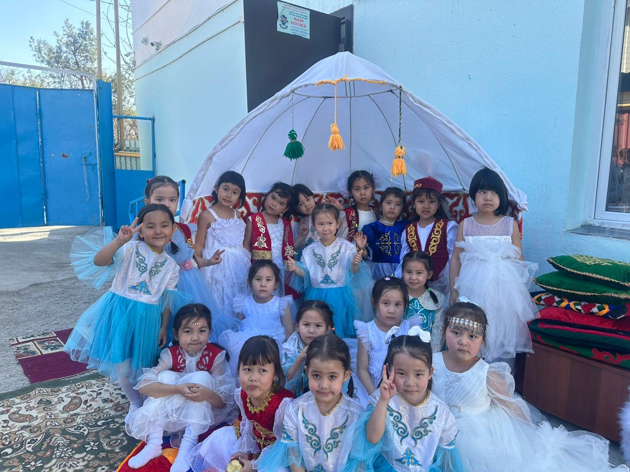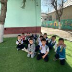 Бөбекжай ауласы түгел темір қорғанмен қоршалған, көгалдандырылған, таза ауада ойнауға жағдай жасалынған.