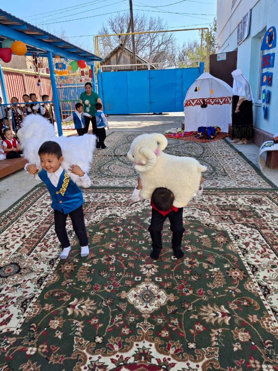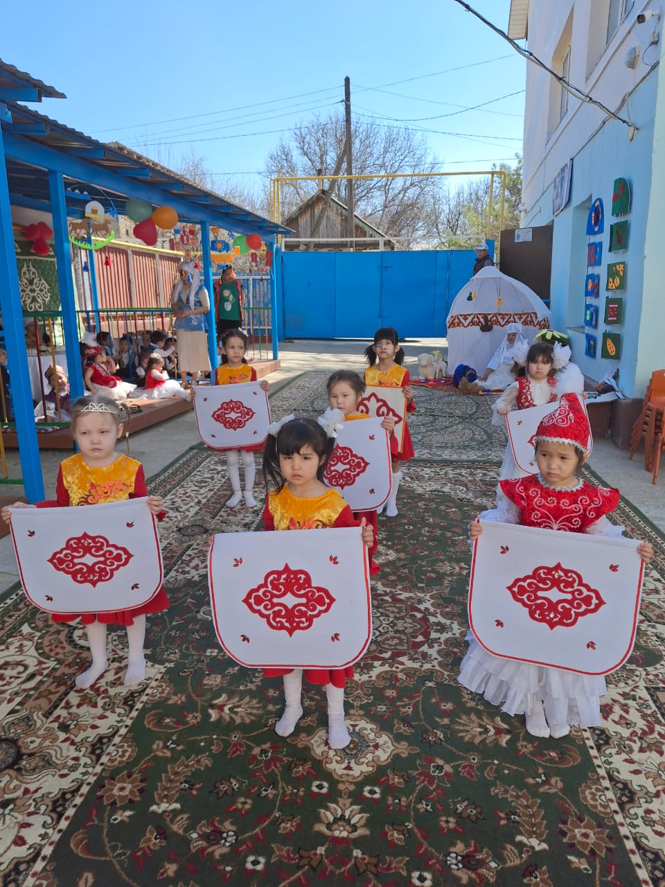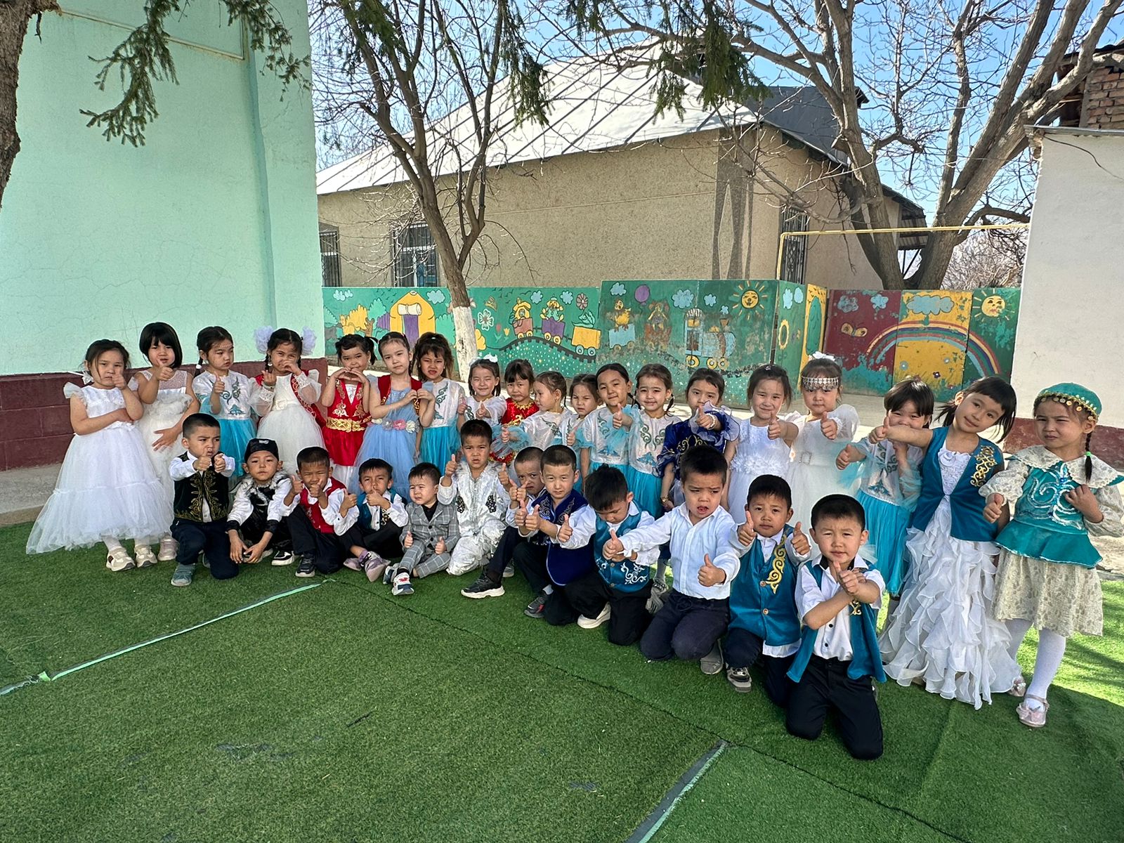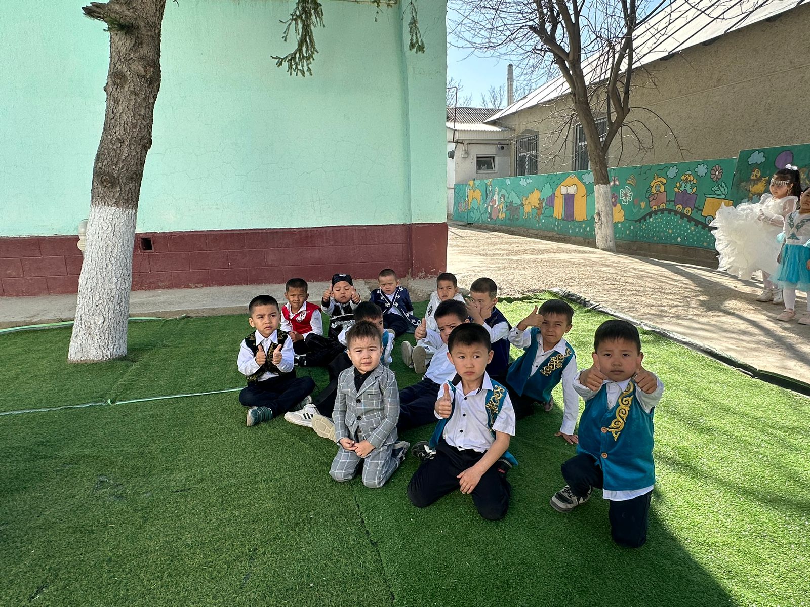 Бөбекжай ауласы түгел темір қорғанмен қоршалған, көгалдандырылған, таза ауада ойнауға жағдай жасалынған.